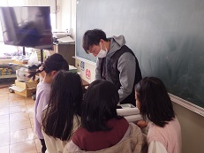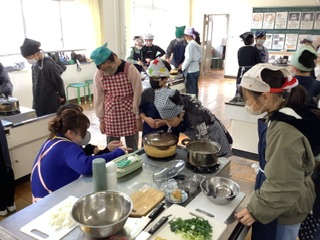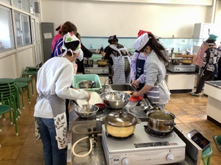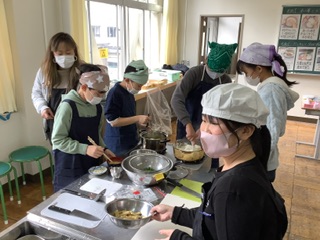 家庭科の学習でご飯とお味噌汁を作りました。 お鍋の中でお米が炊かれている様子を見て火加減を調節したり、お出汁をとって実を煮る順番に気をつけたりしながら、美味しいご飯とお味噌汁を作ることができました。保護者の方にもボランティアとしてご参加いただき、安心・安全に調理実習を進めることができました。 | |||