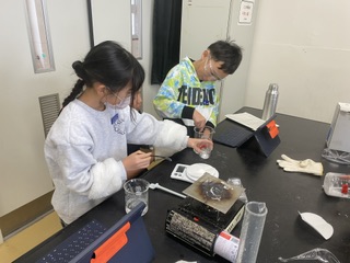 理科の学習では、「物の溶け方」について実験をしました。水の量や温度を変えると、物の溶ける量はどうなるのかを調べました。安全に気をつけながら、協力して取り組むことができました。 | |||