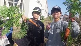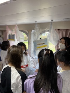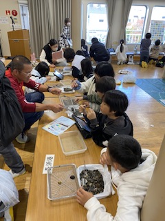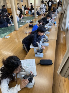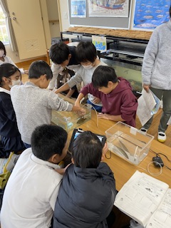 午前中は琵琶湖学習を行っています。琵琶湖の魚やプランクトン、湖底のかいなどを観察しています。魚は実際に触って観察中です。様々な気づきがあったようです。子どもたちは熱心に活動しています! | |||