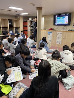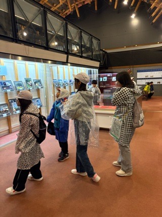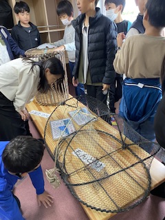 活動室では、琵琶湖の漁業について学習しています。様々な網の種類があり、とる魚によって使い分けているそうです。網の実物もじっくり観察しました。 | |||