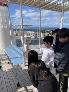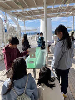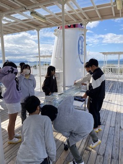 琵琶湖学習で甲板に出て透視度調査をしています。40年前の琵琶湖の水、現在の琵琶湖の水、水道水で比べています。 晴れていて、甲板から美しい景色も見ながらステキな環境で学習中です。 | |||