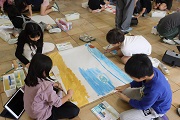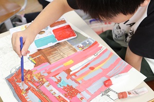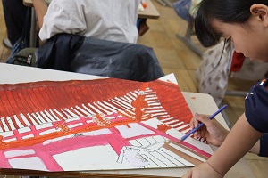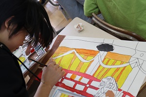 日吉大社で描いた絵に絵の具を使って色を付けています。 色を付け始めると、どんどん鮮やかな絵になってきました。 日吉大社の自然いっぱいの様子を再現しようと丁寧にかけています。この調子で丁寧に仕上げていってほしいです | |||
