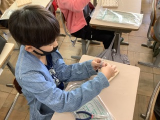 5年生の図工では、ワイヤーを使って自分の思い描く世界を形にする学習に取り組んでいます。まずは針金を曲げたりねじったりして、どんな形ができるかを試し、それが何に見えるかを想像しました。その後、自分が表現したい世界を考え、作品づくりを進めています。 | |||