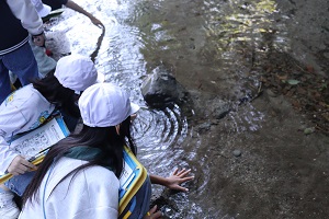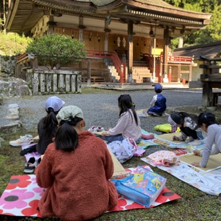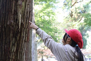 実際に、日吉大社へ行き森林の中に入りに行きました。森林ビンゴをしながら、虫の抜け殻や穴の開いた木などを探して歩きました。よ〜くみるとキノコから煙が出ていたり、字の書ける葉っぱがあったりと新しい発見がたくさんありました。 | |||