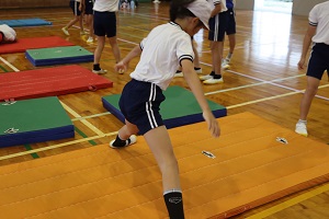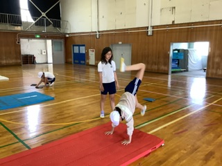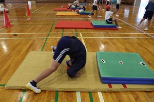 5年生は体育の授業でマット運動に取り組んでいます。現在は「倒立前転」に挑戦中で、手をつく位置や技と技のつながり、技の後の姿勢など、細かなポイントにも気をつけています。最初は難しそうにしていた子どもたちも、繰り返しの練習を通して少しずつ自信をつけ、意欲的に取り組む姿が見られます。 | |||