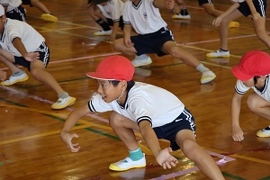 2年生のリズム遊びでは、軽快なリズムの曲に合わせてダンスを楽しみます。この学習では、「全身で踊ること」、「友だちの良い動きを真似すること」を大切にしています。運動場での練習が始まりました。隊形移動では、「高速ラプトルになって移動しよう!」がめあてでした。高速ラプトルになりきって、楽しい気持ちで取り組んでほしいと思います。 | |||