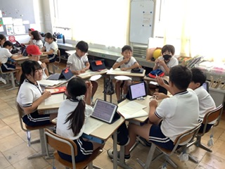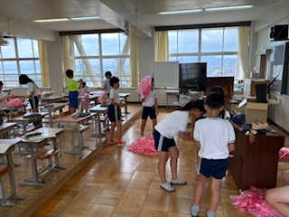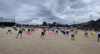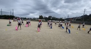 5年生の体育では、運動会に向けてクラスごとのフラッグ演技に取り組んでいます。それぞれのクラスが異なる音楽に合わせて、自分たちらしい動きを工夫しながら覚えようと頑張っています。 | |||