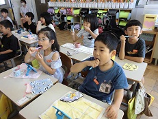 保健室の先生に来ていただき、はみがきの仕方を教えてもらいました。実際に自分の歯ブラシを持ち、教えてもらった磨き方で丁寧に歯を磨きました。これで、虫歯ともお別れかな? | |||