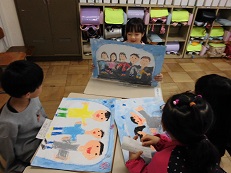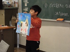 図画工作科では、自分が見つけた「にっこり」の瞬間をパスや絵の具を使って描きました。今日は、完成した絵をグループで紹介しあったり、前に出て発表したりしました。友だちの紹介をうなずいたり、にこにこしながら聞いたりする姿がたくさん見られました。 | |||