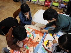 所員の方と教員に真っ黒に焼いてもらった杉の板をきれいに磨いています。磨けば磨くほどきれいになるので、子どもたちは根気強く磨いています。 | |||