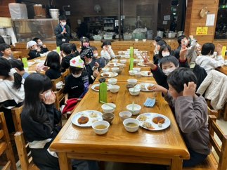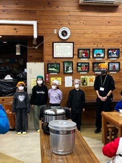 一生懸命杉板を磨いてお腹が空いたところに、おまちかねの昼食。みんな美味しくカレーを食べています。 | |||