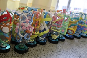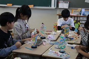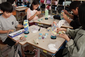 ペットボトルの周りに紙粘土をつけてランプを作っています。自分の将来なりたいものや、好きなものなどを粘土で作ってまわりに付けています。ライトをつけるととてもきれいに光るので、完成が楽しみです。 | |||