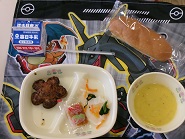 1年生になって初めての給食の日です。まず、先生から給食の配り方、もらい方の説明を聞きました。説明が終わったら、給食当番はみんなの給食の配膳です。初めてですが、配る側ももらう側も上手です。スムーズに準備ができて、みんなそろって「いただきます!」今日のメニューは、コッペパン、牛乳、花型ハンバーグのケチャップソースかけ、彩り野菜、和風ドレッシング、コーンポタージュスープ でした。