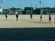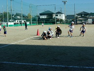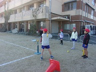 4年生が体育で『Tボール』の試合をしていました。野球型のスポーツです。ピッチャーはおらず、ボールを台においてそれをバットで打ちます。打者が打って塁に出るのが早いか、受けた野手のところに守りの全員が集まるのが早いかを競います。見ていると、子どもたちには守り方に作戦があるようです。