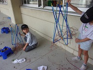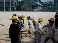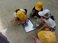 1年生が生活科の学習でしゃぼん玉を作りに運動場に出てきました。うまくできるかな?とみんなワクワクしています。シャボン玉液を入れて、シャボン玉遊びがスタートしました。「いっぱい出てきたよ!」「大きいのができた!」とみんな大喜びです。