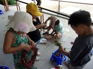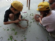 春に種から育てた朝顔が夏にはたくさんの花を咲かせました。夏休みもお家に持って帰って世話を続け、夏の終わりには種もたくさんとれました。今日は、ツルをくるくる巻いてリースを作ります。からまったツルを支柱から取るのにひと苦労です。お友達と一緒に集めたツルをねじってくるりとまるめ、素敵なリースができました。