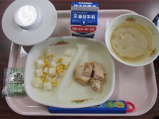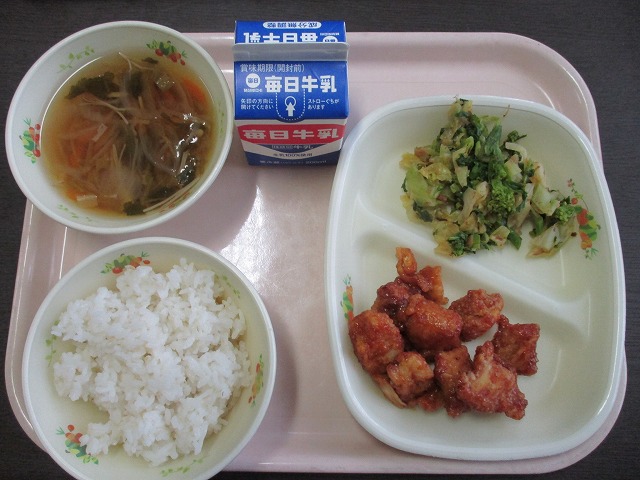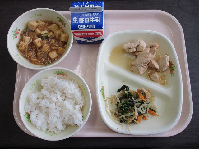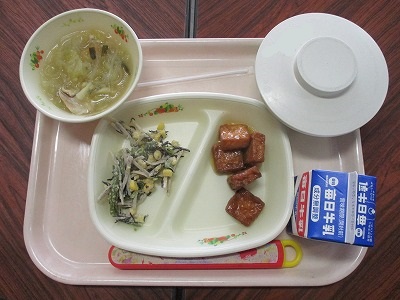 今日の給食は、 ・麦ごはん ・牛乳 ・厚揚げのユーリンチーソースがけ ・ごぼうとひじきのごまサラダ ・はるさめスープ でした。