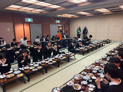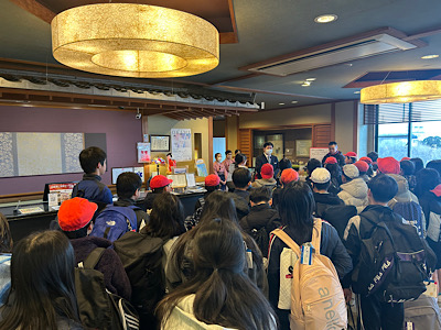 実行委員さんの司会で入館式を行いました。旅館の方からは「首をながーくして待ってました」とお言葉をいただき、みんなで『よろしくお願いします』としっかり挨拶をしてお辞儀をしました。