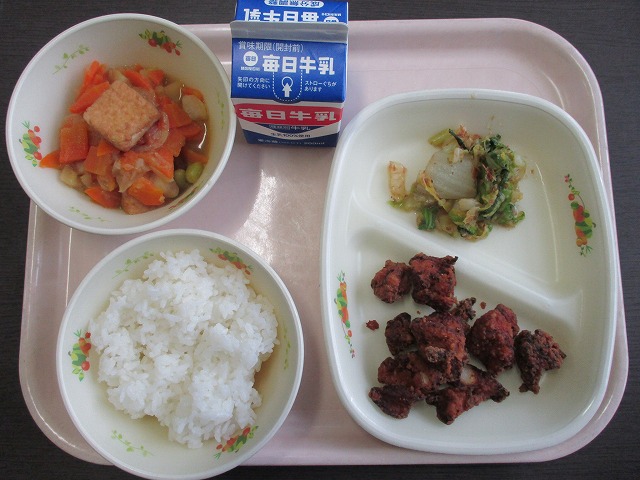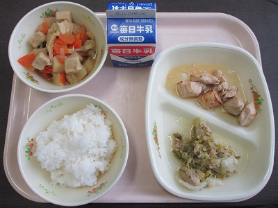 12月12日(金)の給食は、 ・白ごはん ・牛乳 ・鶏肉のガーリック焼き ・はくさいとツナの炒め物 ・高野豆腐の煮物 でした。