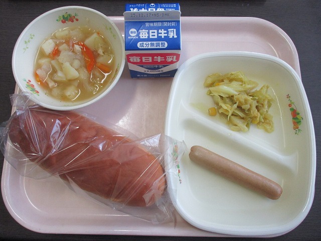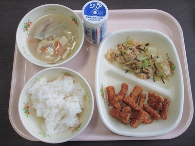 12月11日(木)の給食は、 ・白ごはん ・のむヨーグルト ・いかの磯辺揚げ ・実だくさんみそ汁 ・キャベツとささみの塩こんぶあえ でした。