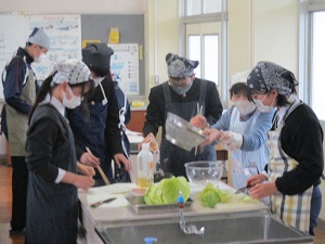 2年生では、地域の食材「関津キャベツ」と「瀬田しじみ」を使った調理実習を行いました。