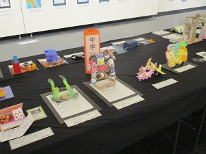 市内の幼稚園、小学校、中学校の子どもたちの作品が展示されていました。どれも力作揃いで、本校からも生徒の作品が出品されていました。
