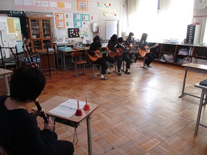 本校は、ギターとハンドベルとアルトリコーダーを使った合奏を発表しました。練習の成果が十分に出せました。
