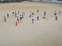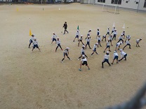 体育の学習で、マイペース走に取り組みました。“黄金の4曲”と呼んでいる運動会で2年生の出番で使った曲を流しながら走りました。