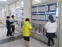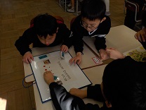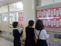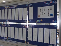 書写の学習で、校内に展示されている各学年の書き初めの鑑賞をしました。友だちの作品をじっくりとみて、書き初めに込められた思いを感じ取りながら、すてきだなと思ったことを書きとめていました。