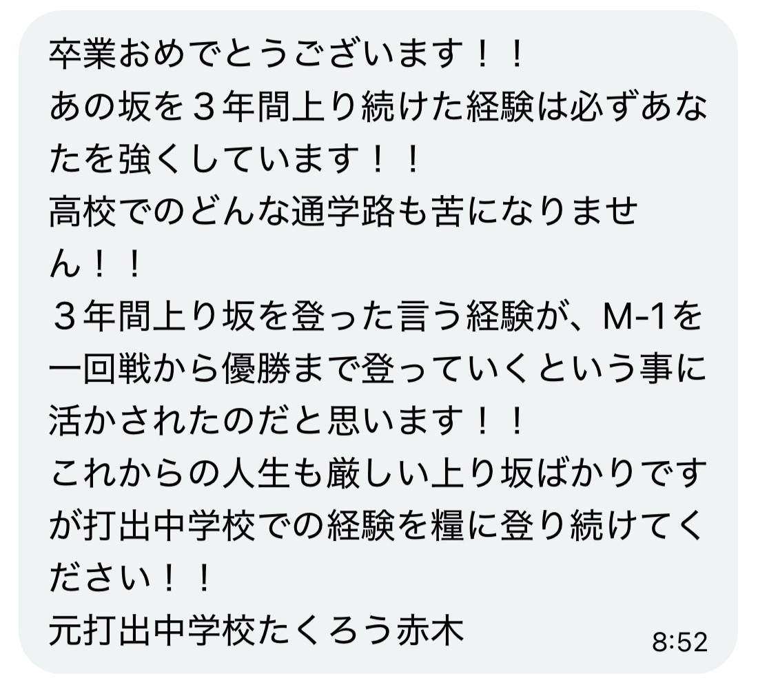 皆さんの大先輩であり、M-1グランプリ王者として活躍されている、漫才コンビ「たくろう」の赤木裕さんから、卒業生の皆さんへ心温まるメッセージが届きました。赤木さんは本校・打出中学校の卒業生であり、在校当時に仲間と創り上げた数々の思い出を胸に、現在も第一線で活躍されています。