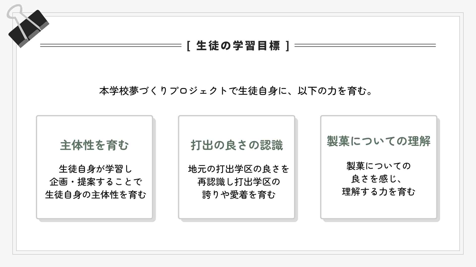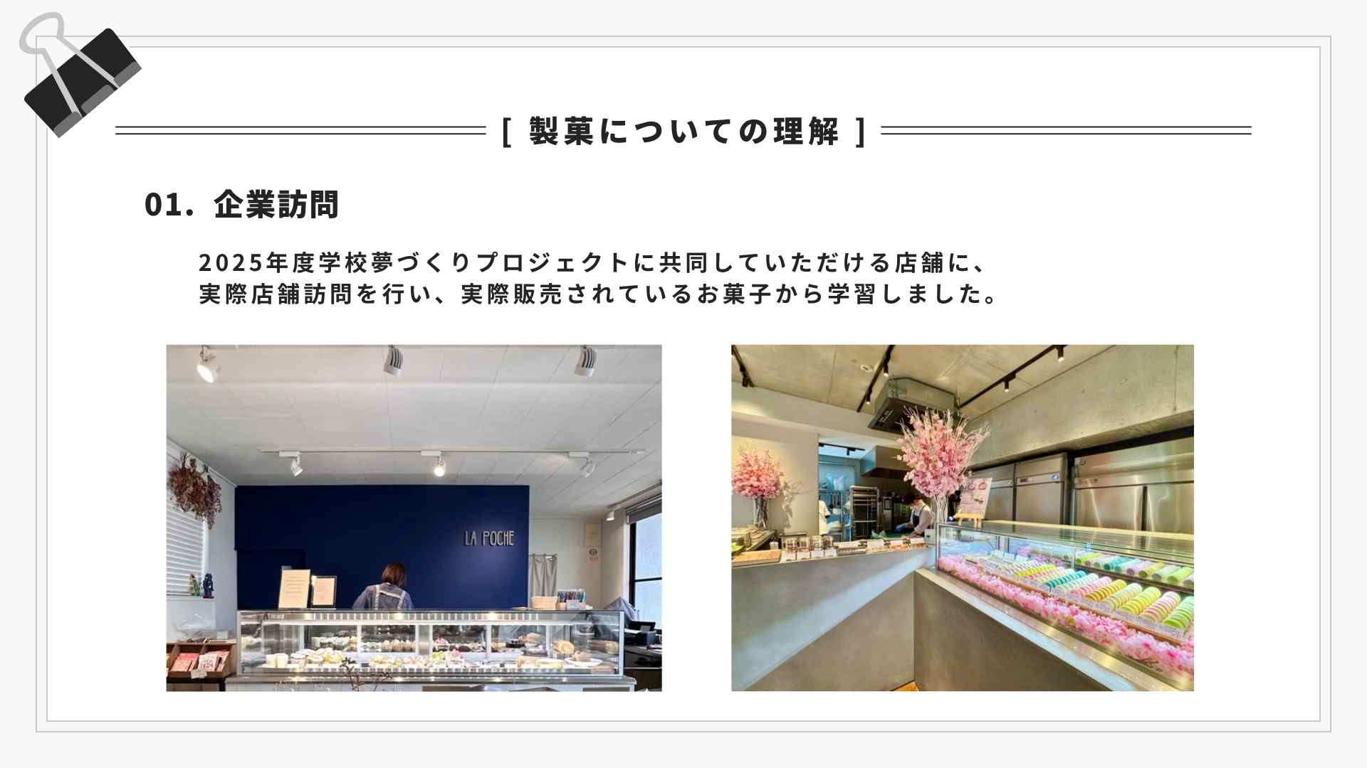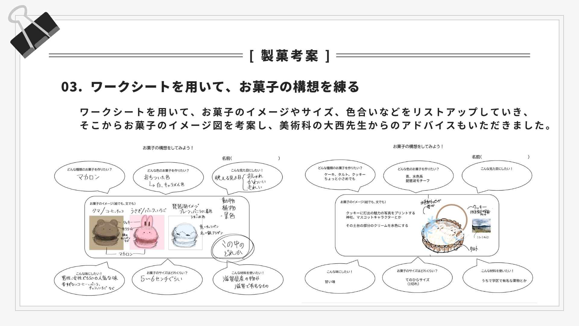 今年度の「夢づくりプロジェクト」は、企業連携ということで、地域のお菓子屋さんと学校のコラボを計画しました。生徒たちが考えたお菓子を地域の有名店に制作していただき、販売まで行う。たいへん夢のあるプロジェクトです。