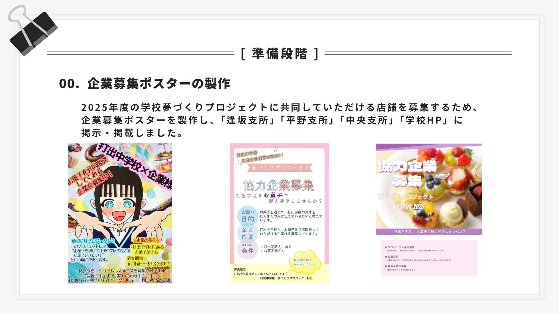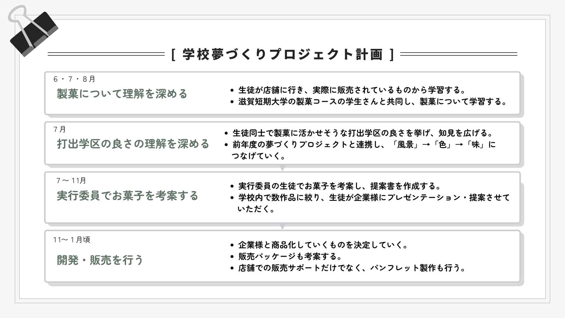 打出学区には、たくさんのお菓子屋さんがあります。大変有名な洋菓子店や老舗の和菓子屋など、今回の企画に協力いただけるお店は、HPで募集するとともに、学運協、自治連合会の皆様にもお手伝いいただき、支所・公民館にもポスターを掲示させていただきました。また近隣の滋賀短期大学さんにも協力いただき、今回の企画に快く、お受けいただいた洋菓子店2店舗が決定しました。