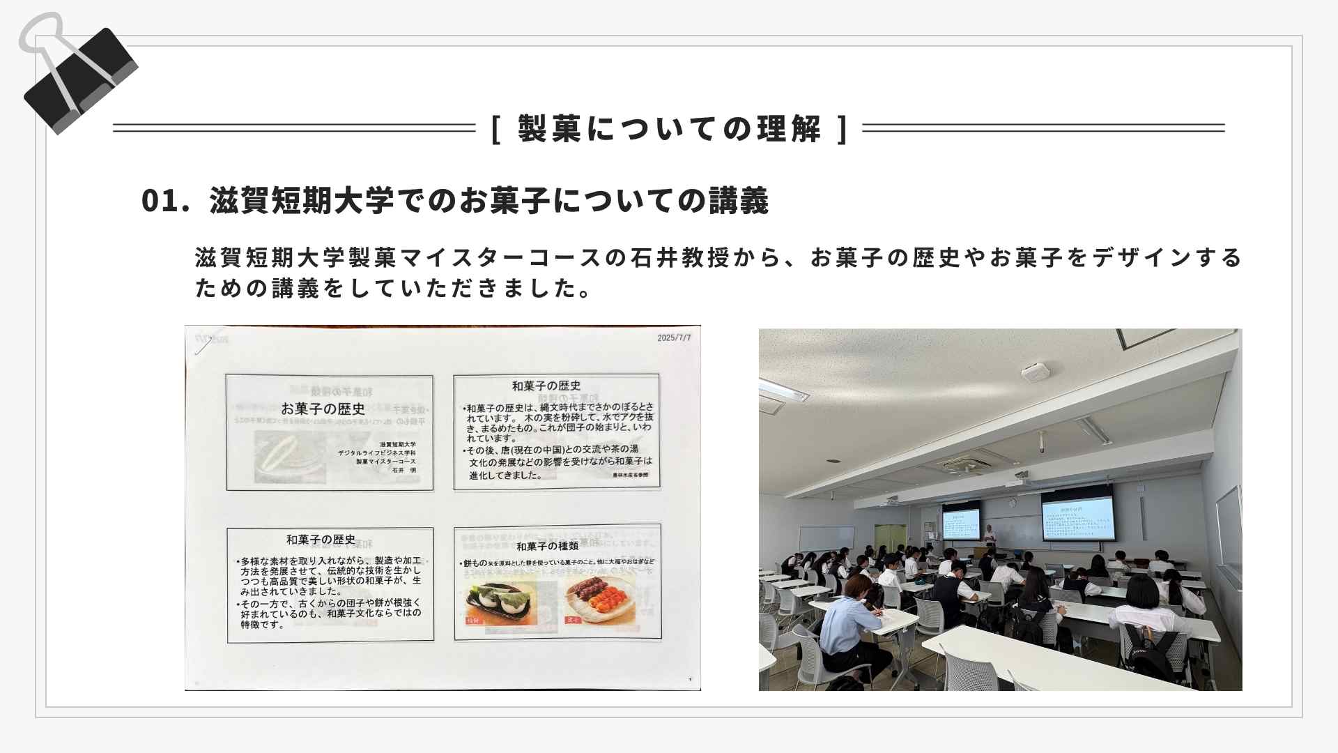 滋賀短期大学の製菓マイスターコースの教授や学生さんにもご協力いただき、お菓子についての基礎を学びました。