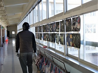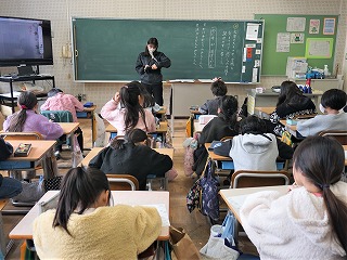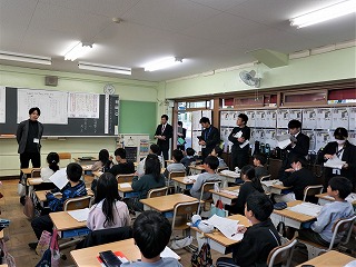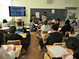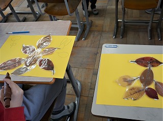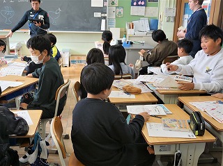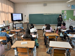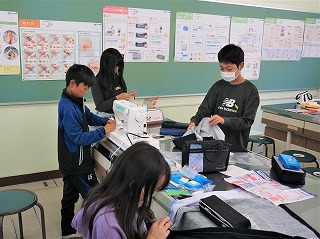 4年生の国語では、交流会をしていました。5年生の家庭科ではエプロンを作っています」。6年生の書写では、筆の良さを生かしてメッセージカードを作っています。
