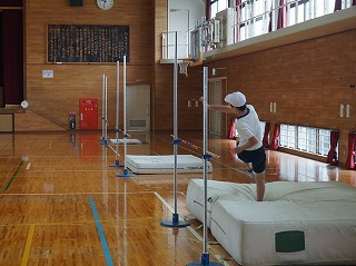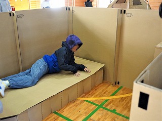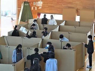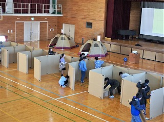 今日は、6年生の防災学習で、体育館の避難所設営を行いました。ダンボールパーテーションを使ってプライベート空間を作り、ダンボールベッドを組み立てます。受付や更衣室、授乳室、トイレなど、避難所に必要なものを設置しました。