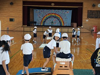 1年生の道徳では、いのちについて考えました。2年生の体育は跳び箱運動遊びに取り組んでいます。3年生の算数は少人数です。分数の学習をしています。
