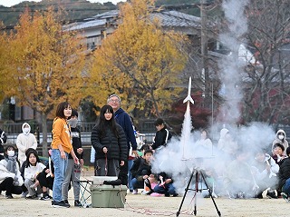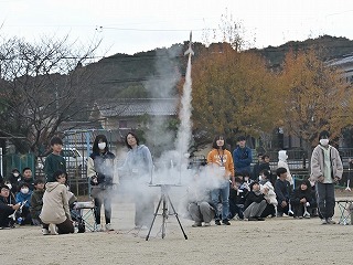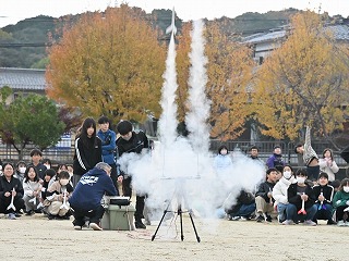 6年生は一人一機のロケットを、全校児童が見守る中、発射しました。自分のロケットだけ、飛ばないかもしれない、という不安をかかえながらも、本物のロケットは、わずか0.3秒で時速200kmのスピードで体育館の屋根の高さまで打ち上がりました。打ち上がるたびに、歓声が上がっていました。
