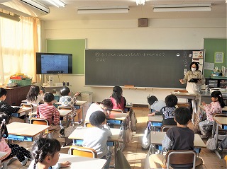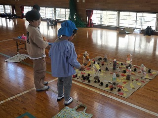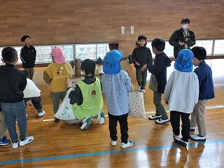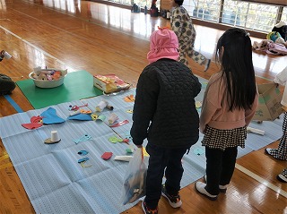 今日は「秋まつり」のひです。1年生が以前からこの日のために準備をしてきた楽しいゲームを、園児さんたちにしてもらっています。園児さんたちは、とても楽しそうに遊んでいました。秋みつけで集めた素材を使って、工夫して遊びを考えました。