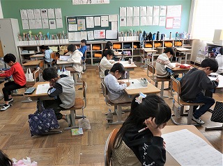 4年生の国語では、慣用句の学習をしていました。5年生の理科は、「塩は溶けるとなくなるのか」という疑問を実験で解決しています。6年生の算数は「比」の学習です。縦横3:2の長方形で、たてが60cmのとき、横は何cmになるか考えています。