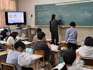 2年生の体育では、ジャンプをリズムに乗ってしていました。4年生の算数では、中学校でいう関数(比例)の学習を、小学校で扱う言葉で表現しています。6年生の算数は縮尺の確認をしています。