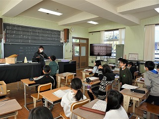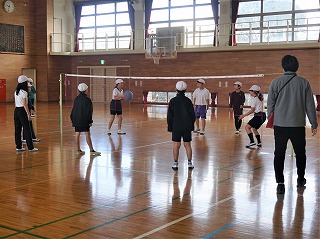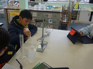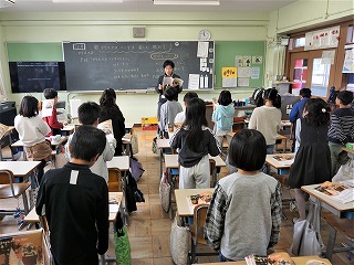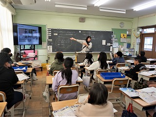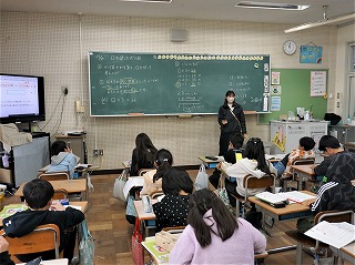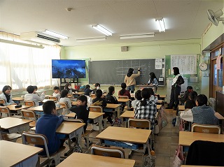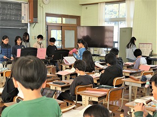 4年生の体育は、キャッチバレーボールです。チームに分かれて対戦していました。5年生の理科では、ミョウバンの水溶液のろ過をしています。実験結果も児童が考察します。6年生の外国語科では、「動物保護」について、英語でやり取りする学習をしています。ALTの先生とも会話しています。