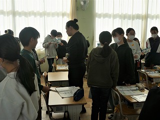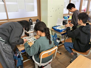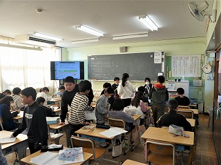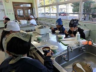 4年生の算数では、比例の関係にある学習についての確認プリントをしていました。5年生の家庭科は調理実習です。ご飯とみそ汁をつくりました。とても美味しいという声があがっていました。6年生の総合では、防災学習のまとめとして「パンフレット」作りをしています。