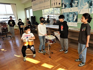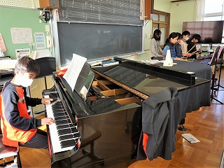 5年生の音楽では、これまで練習してきた合奏の発表を行いました。曲目は「仮面ライダー」です。それぞれの楽器を一生懸命練習し、意気の合ったすばらしい合奏でした。