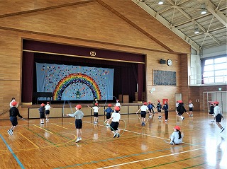 1年生の体育では、体育館でなわとびの練習をしています。1分間に何回跳べるかに挑戦しています。2年生の生活では、発表に準備と練習をしています。