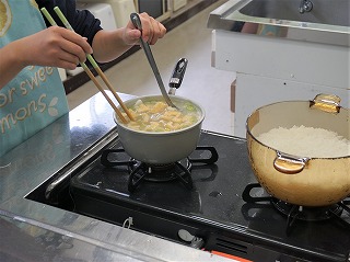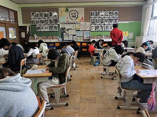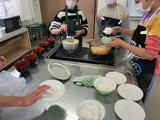 5年生の家庭科では調理実習をしました。ご飯とみそ汁です。ご飯が上手に炊けました。6年生の書写では、書き初めの練習をしていました。勢いのある字にこだわって描いています。