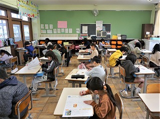 4年生の総合では、自分が進めたアンケートをグループで発表し合っています。5年生は、明日の卒業式に在校生代表として参加します。6年生は、最後の思い出作りをしています。