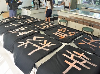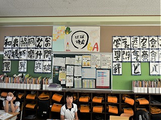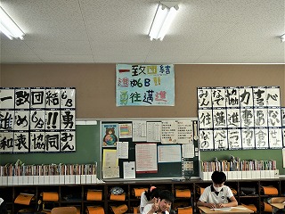 6年生もリハーサルを行いました。フラッグの団体演技は実に素晴らしく仕上がりました。教室には、A組B組それぞれの、スローガンを書で表現しています。明日は最高のパフォーマンスを見せてくれるでしょう。