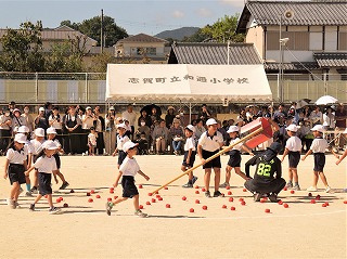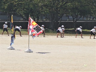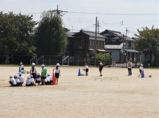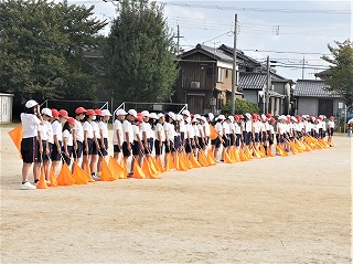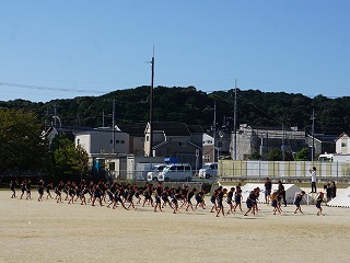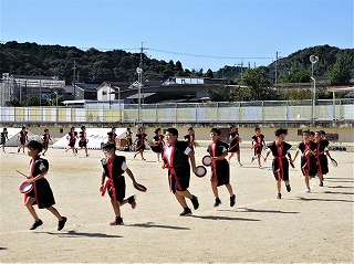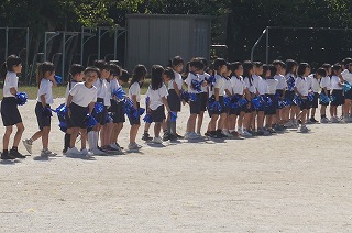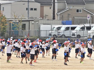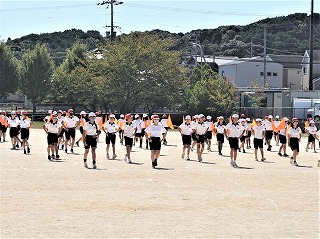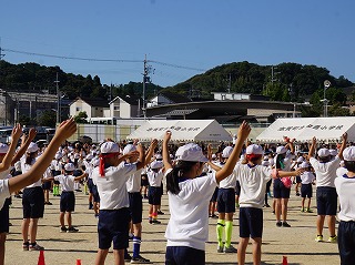 今日は、すがすがしい秋空のもと、和邇小学校運動会が開催されました。6年生を中心に準備をし、当日の運営を進めました。写真は準備体操と応援披露、1年生の団体競技です。