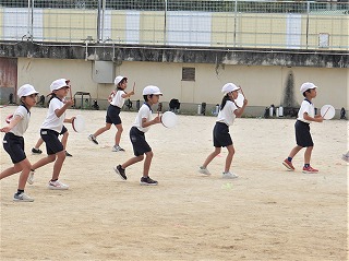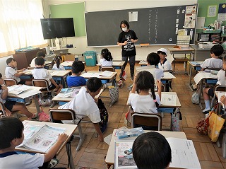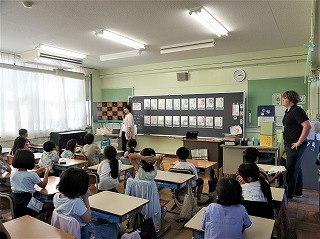1年生の国語では、いきものずかんを作ります。2年生の外国語活動では、ALTとともにカードを活用して、コミュニケーションゲームをしています。体育では、団体競技の練習です。「団体演技」と「団体競技」を使い分けています。