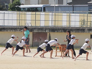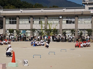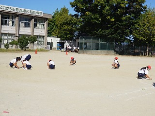 今年のプログラムは各学年の「団体競技」と低学年、中学年、5年、6年の「団体演技」です。写真は2年、3年、4年の「団体競技」の様子です。団体競技では、競い合うことを取り入れ、「昨日の自分を越える」ことを目標にしています。